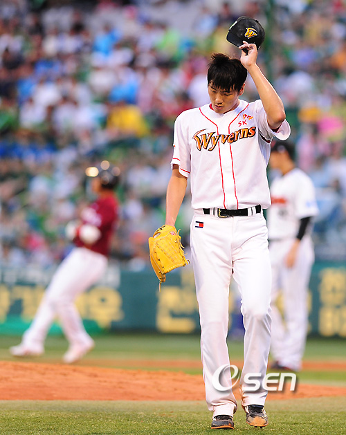1회초 아웃카운트 하나를 잡는 동안 6실점 한 김광현이 안타를 맞고 아쉬워 하고 있다. /spjj@osen.co.kr