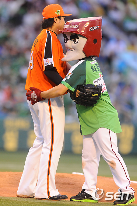 1회말 이스턴리그 류현진 선발투수가 턱돌이의 격려를 받으며 마운드에 서고 있다. /soul1014@osen.co.kr
