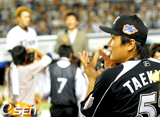 경기후 김태균이 MVP로 선정된 세이부 가타오카에 박수를 보내고 있다. /jpnews@osen.co.kr