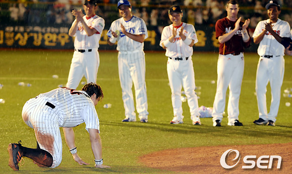 경기 종료 후 MVP 홍성흔이 동료들에게 인사하고 있다. /soul1014@osen.co.kr
