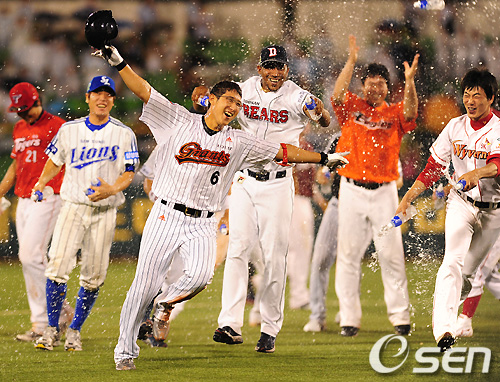 9회말 끝내기 안타를 친 황재균이 양팀 선수들의 축하를 받고 있다. /spjj@osen.co.kr