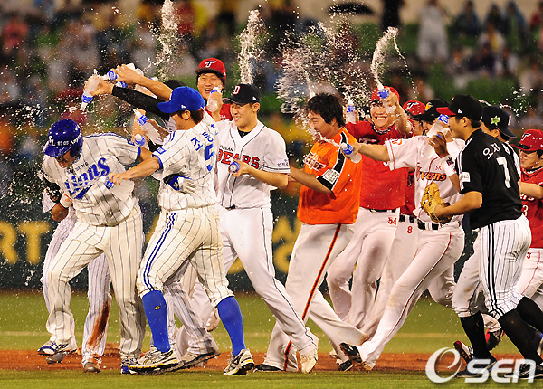 9회말 끝내기 안타를 친 황재균과 진갑용이 양팀 선수들의 축하를 받고 있다. /spjj@osen.co.kr