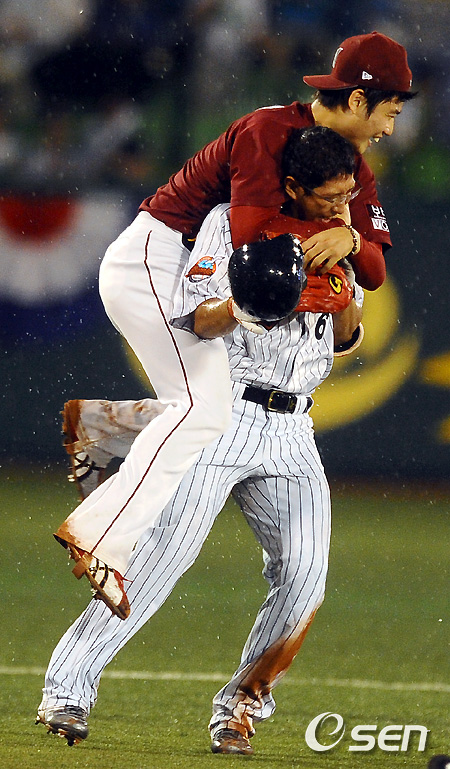 경기 종료 후 끝내기 안타를 친 롯데 황재균이 상대 투수인 손승락의 축하를 받고 있다. /soul1014@osen.co.kr