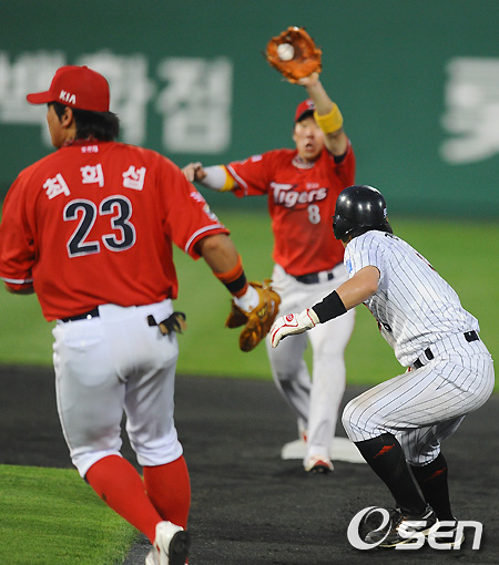 4회말 1사 1,3루 롯데 손아섭의 삼진때 1루 주자 전준우가 주루 미스로 협살에 걸리고 있다. /soul1014@osen.co.kr