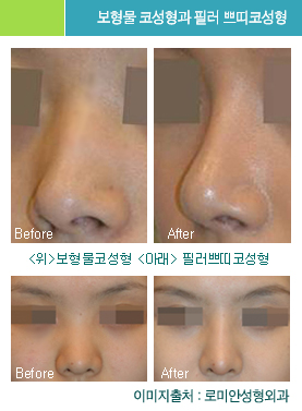 코는 간단하게 필러나 보톡스를 사용하는 쁘띠성형술이 있고, 매부리코처럼 콧등의 모양을 다시 잡아주어야 할 경우에 수술을 시행한다. 코의 높이뿐만 아니라 길이나 각도까지도 자연스럽게 잡아주도록 한다.