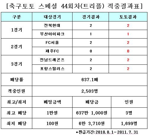 체육진흥투표권 수탁사업자인 오리온 그룹계열의 스포츠토토㈜(www.sportstoto.co.kr)는 지난달 31일에 벌어진 전북 현대-부산 아이파크(1경기)전, FC 서울-제주 FC(2경기)전, 전남 드래곤즈-포항 스틸러스(3경기)전 등 K-리그 3경기를 대상으로 한 축구토토 스페셜 44회차 트리플 게임에서 3경기의 결과를 정확히 맞힌 참가자가 모두 2503명 나와 각각 베팅 금액의 637.1배에 해당하는 적중상금을 가져가게 됐다고 밝혔다.