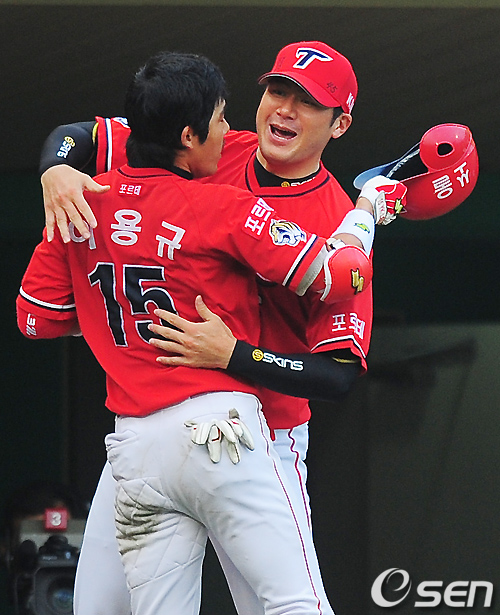 7회초 무사 주자 없는 상황에서 KIA 이용규가 이종범에 이어 백투백 솔로홈런을 날린 후 덕아웃에서 서재응과 포옹을 하고 있다./rumi@osen.co.kr