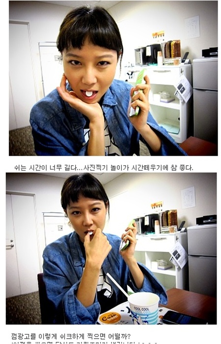 사진 속 공효진은 촬영 차 일본을 방문한 것으로 보이며 작업 중 쉬는 틈을 타 마치 껌 CF에 등장할 것만 같은 포즈를 취하고 있다. 첫 번째 사진에는 반쯤 벌린 입 속에 껌을 넣고 턱을 괸 모습이 인상적이다. 공효진은 '쉬는 시간이 너무 길다....사진 찍기 놀이가 시간 때우기에 참 좋다'고 적었다. 두 번째 사진에서 역시 껌을 입에 넣고 있는 공효진 특유의 시크한 표정이 눈에 띈다. 사진 아래는 '껌광고를 이렇게 쉬크하게 찍으면 어떨까? 이껌을 씹으면 당신도 카뤼즈마가 생깁니다. ㅎㅎㅎ'라고 적으며 시크한 매력을 뽐냈다.