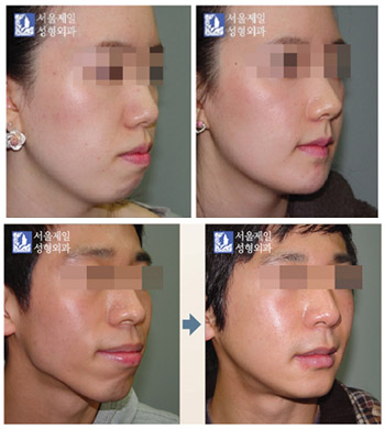 <사진> 돌출입 수술을 한 여성의 사례(위)와 돌출입수술 및 사각턱수술을 한 남성.