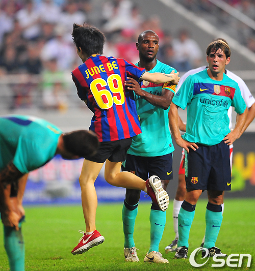 4일 저녁 8시 서울월드컵경기장에서 열린 'FC 바르셀로나 초청 K리그 올스타전 2010'에서 전반전 도중 경기장에 난입하면서 선수들을 당혹스럽게 만든 팬들의 정체가 밝혀졌다.
