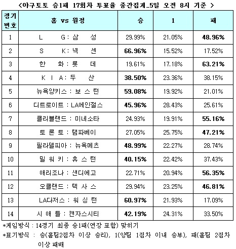 오리온 그룹계열의 스포츠토토 온라인 발매사이트인 베트맨(www.betman.co.kr)은 오는 6일부터 이틀간(이하 한국시간)까지 벌어지는 국내프로야구 4경기, 미국프로야구 MLB 10경기 등 총 14경기를 대상으로 한 야구토토 승1패 17회차 투표율 중간집계 결과 전체 참가자의 38.50%가 4위 자리를 노리고 있는 KIA가 두산을 상대로 힘겨운 승리를 거둘 것으로 내다봤다.