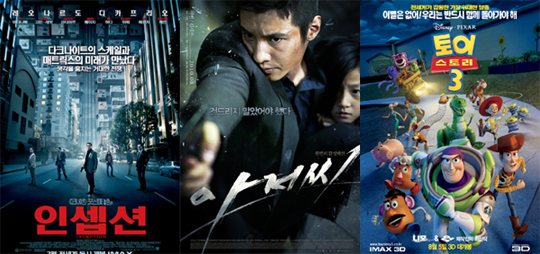 영화 ‘인셉션’ ‘아저씨’ ‘토이스토리3’가 치열한 박스오피스 쟁탈전을 벌이고 있다. 박스오피스 순위의 결정적인 영향을 미치는 것은 주말 극장 관객 스코어. 어떤 작품이 주말에 가장 많은 관객을 끌어 모아 박스오피스 선두에 오를지 관심이 모아지고 있다.