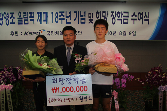 8월9일 저녁 서울 송파구 올림픽파크텔에서 열린 ‘황영조 올림픽 제패 18주년 기념 및 희망장학금 수여식’에서 황영조 감독은 전북체고 노시(18. 3학년) 김포제일고 염고은(16. 1학년)에게 ‘황영조 희망장학금’을 전달했다. 마라톤 유망주인 이들은 각각 장학금 100만 원과 450만 원 상당의 물품을 함께 받았다.
