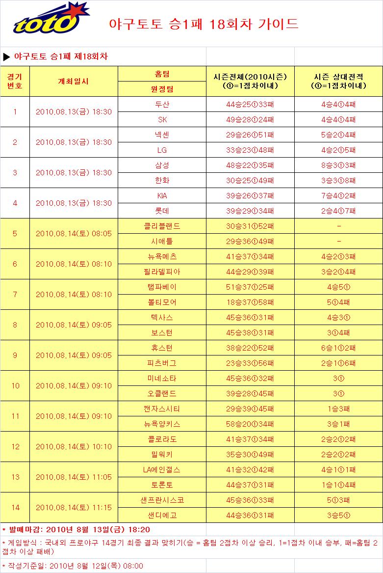 이밖에 콜로라도-밀워키(12경기)전과 샌프란시스코-샌디에고(14경기)전에서는 콜로라도(47.34%)와 샌디에고(39.82%)의 승리를 각각 전망했다. 한편 이번 야구토토 승1패 18회차 게임은 첫번째 경기 시작 10분전인 13일 오후 6시20분에 발매를 마감한다.