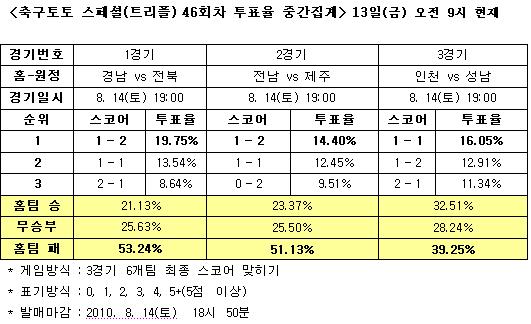 [축구토토] 스포츠토토 공식 온라인 발매 사이트인 베트맨(www.betman.co.kr)는 오는 주말 열리는 K-리그 3경기를 대상으로 하는 축구토토 스페셜 46회차 투표율 중간집계 결과 경남-전북전에서 축구팬 53.24%가 원정팀 전북의 우세를 예상했다고 밝혔다.