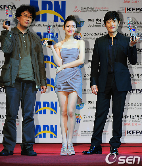 봉준호 손예진 이병헌이 APN 아시아영화인상을 수상한 한 후 포즈를 취하고 있다./rumi@osen.co.kr