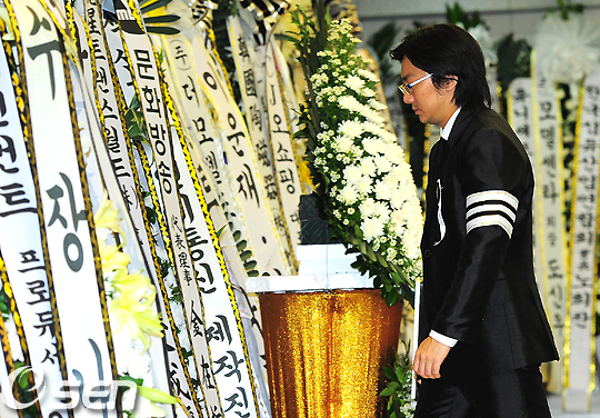 14일 오후 패션디자이너 앙드레김(본명 김봉남) 빈소가 마련된 서울 종로구 연건동 서울대학교 병원 장례식장에 아들인 김중도씨가 고개를 숙인채 접객실로 향하고 있다.