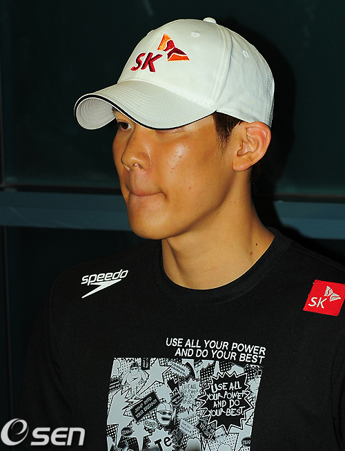 박태환이 입국장 인터뷰 중에 입술을 풀고 있다./rumi@osen.co.kr