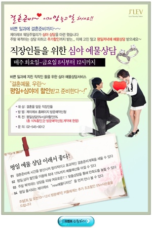 때문에 한 웨딩업체에서는 고객을 위한 묘수를 내놨다. 웨딩업체 ‘제이레브(www.jlev.kr)’에서는 직장인들을 위한 심야 예물상담을 해주고 있다. 서울, 경기권에서 직장 생활을 하는 예비 부부들은 오후 8시부터 자정까지 ‘제이레브’에서 예물 상담을 받을 수 있다.
