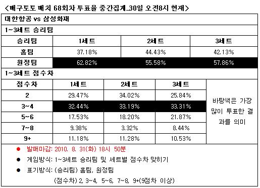 스포츠토토의 공식 온라인 발매사이트인 베트맨(www.betman.co.kr)은 오는 31일 오후 7시에 치러지는 2010 수원컵 프로배구대회 대한항공-삼성화재전을 대상으로 한 배구토토 매치 68회차 게임 투표율 중간집계 결과 원정팀 삼성화재의 우세를 예상하는 것으로 나타났다.