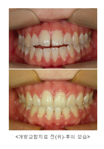 개방교합이란 이렇게 비정상적으로 앞니가 닿지 않는 부정교합을 말한다. 정상적인 앞니사이의 교합은 윗니가 아랫니를 2mm정도 덮어줘야 한다. 또한 앞니의 절단면끼리 닿았을 때는 어금니는 닿지 않아야 정상이다.