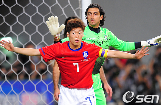 전반 한국 박지성이 이란 오스구에이 골키퍼 앞에서 손을 벌리고 코너킥을 기다리고 있다. /jpnews@osen.co.kr