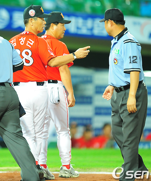김 감독은 지난 14일 사직 롯데전 3회말 추평호 주심에게 항의했다. 롯데의 베이스코치들이 사인을 훔친다는 것이었다. 박계원 3루 작전코치가 공필성 1루 주루코치에게 전달, 상대 포수의 사인을 훔친 후 1루 코치가 다시 타자에게 알려준다는 것이었다.