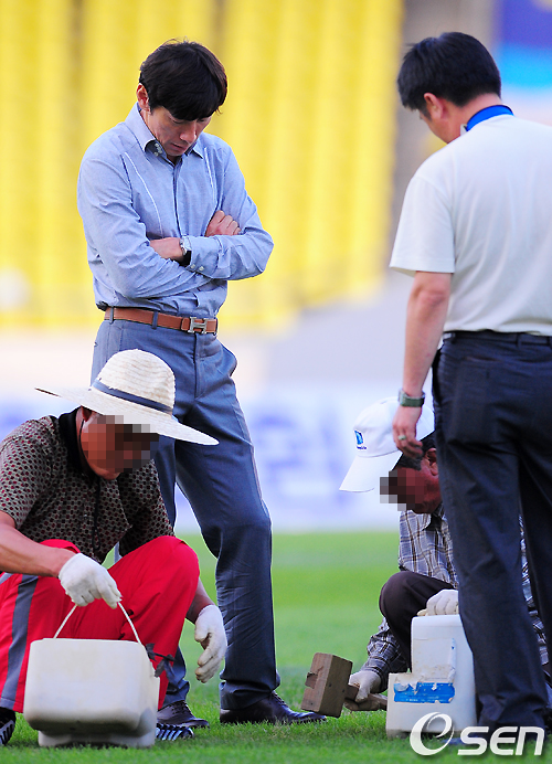 경기전 성남 신태용 감독이 보수하는 그라운드의 잔디 상태를 바라보고 있다. /jpnews@osen.co.kr