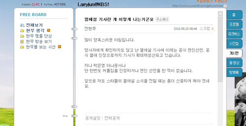 전현무 KBS 아나운서가 자신의 미니홈피를 통해 후배 박은영 아나운서와의 열애설을 공식 부인했다.