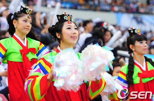 22일 잠실구장에서 열린 '2010 CJ마구마구 프로야구' 두산 베어스와 SK 와이번스의 더블헤더 2차전 경기, 민족 최대의 명절 추석을 맞아 두산 치어리더들이 한복을 차려입고 열띤 응원을 펼치고 있다.