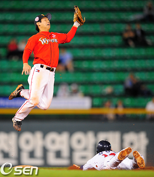 22일 잠실구장에서 열린 '2010 CJ마구마구 프로야구' 두산 베어스와 SK 와이번스의 더블헤더 2차전 경기, 8회말 1사 1루에서 2루 도루를 시도한 두산 고영민을 잡기 위해 SK 최윤석이 점프를 했지만 볼을 놓치고 있다.