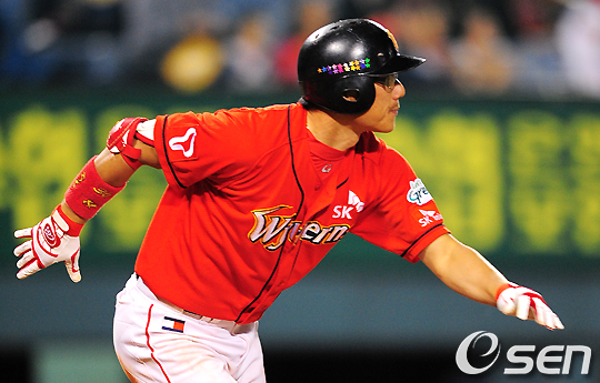 22일 잠실구장에서 열린 '2010 CJ마구마구 프로야구' 두산 베어스와 SK 와이번스의 더블헤더 2차전 경기, 11회초 1사 2루에서 SK 박정권이 1타점 적시 2루타를 날리고 1루로 향하고 있다.