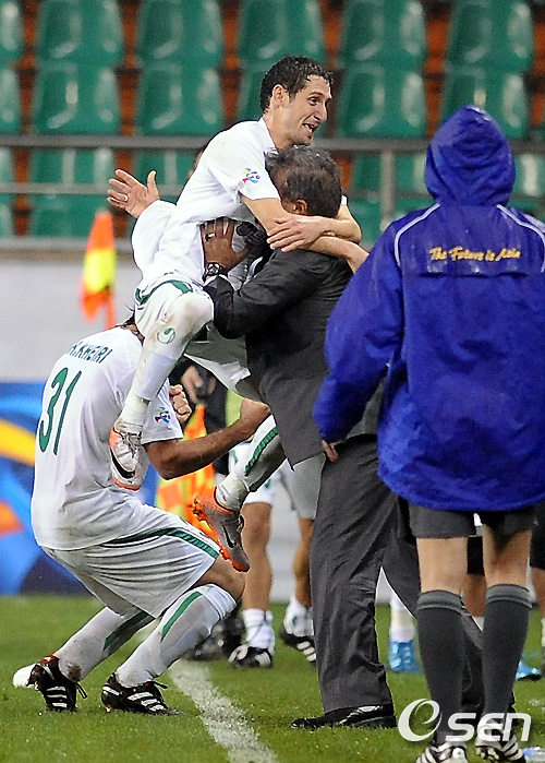 후반 좁 아한 카라트바리가 동점골을 넣고 에브라힘 자데 감독과 환호하고 있다./soul1014@osen.co.kr