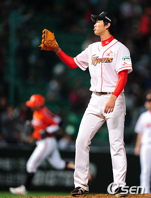 8회초 마운드에 오른 김광현이 한화 강동우에게 좌측 담장을 넘어가는 솔로홈런을 맞고 아쉬운 표정을 짓고 있다. /spjj@osen.co,kr