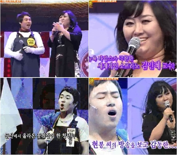 SBS 예능프로그램 '놀라운 대회 스타킹'에서 '꽃게잡이 폴포츠'로 화제가 된 29세 남현봉 씨를 돕겠다고 한국 성악계의 '여자 강호동' 김인혜 교수가 나섰다.