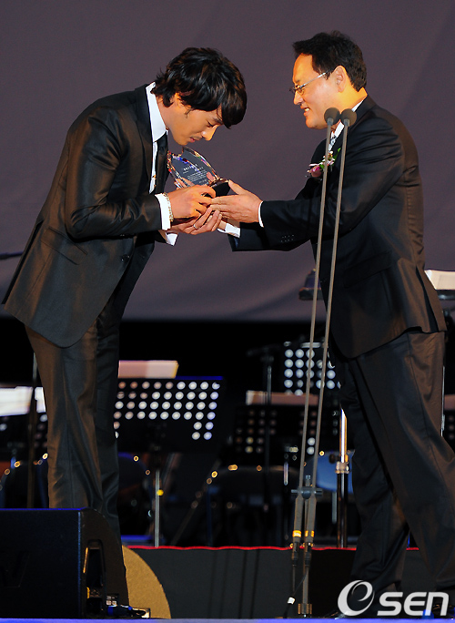 소지섭이 무대 위에서 유인촌 문화체육관광부 장관으로부터 '문화교류 공로패'를 수여받고 있다./rumi@osen.co.kr