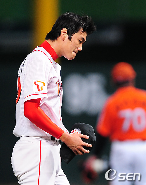 <사진> 2010 프로야구 SK 와이번스와 한화 이글스의 경기가 25일 인천 문학야구장에서 열렸다. 7회초 한화 오선진에게 안타를 맞아 1-2로 역전을 당한 SK 김광현이 이닝을 마치고 아쉬운 표정으로 덕아웃으로 가고 있다. /spjj@osen.co,kr