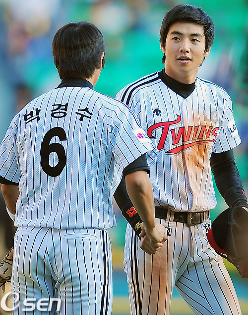1회말을 마치고 이대형이 박경수에게 축하를 받고 있다./rumi@osen.co.kr