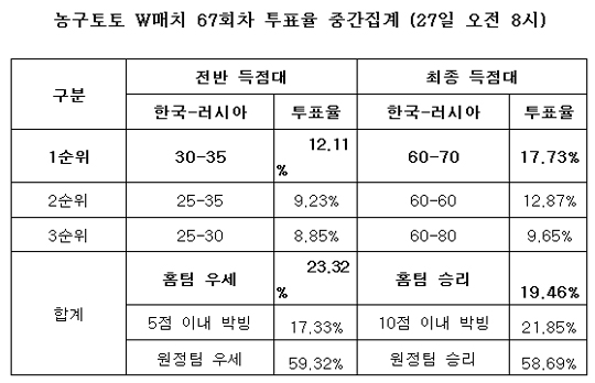세계여자농구선수권 12강전 농구토토 W매치 67회차 투표율 중간집계 결과