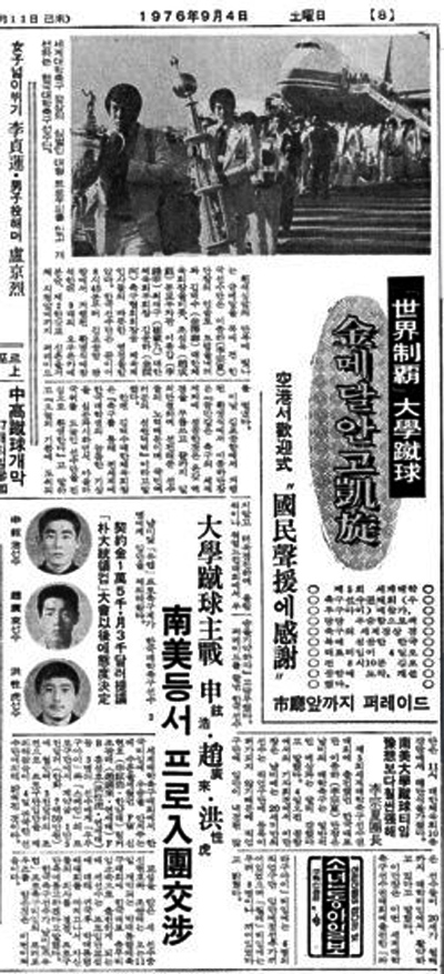 <사진>한국 대학선발팀이 개선한 모습을 보도한 1976년 9월 4일자 동아일보 체육면. 기사 내 사진 중 맨앞에 트로피를 들고 있는 사람이 조광래 현 대표팀 감독이다.
