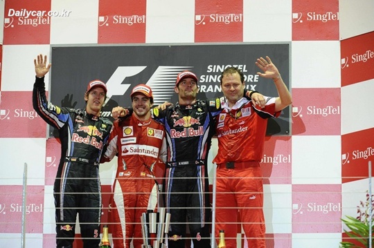 싱가포르 마리나베이 스트리트 서킷에서 펼쳐진 F1 15라운드 경기에서 페르난도 알론소(페라리)가 폴 투 피니시로 올 시즌 바레인, 독일, 그리고 이탈리아에 이어 4번째 우승을 거머졌다. 알론소는 2그리드에 위치했던 세바스찬 베텔(레드 불 레이싱)과 마지막까지 치열한 선두자리를 다투면서 힘겨운 레이스를 펼쳐야만 했을 정도로 치열했다.