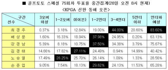 국내 골프팬들은 KPGA '신한 동해 오픈'에서 최경주의 언더파 가능성을 가장 높게 점치고 있는 것으로 나타났다.