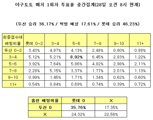 체육진흥투표권 수탁사업자인 스포츠토토(www.sportstoto.co.kr)는 오는 29일 벌어지는 20010 프로야구 포스트시즌 준플레이오프 두산-롯데전을 대상으로 한 야구토토 매치 1회차 투표율 중간집계 결과 전체 참가자 가운데 롯데의 승리를 예측한 비율이 46.23%로 두산의 승리 예상 비율(36.17%)을 앞섰다고 밝혔다.
