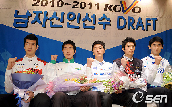 28일 오전 서울 청담동 호텔 리베라에서 열린 프로배구 2010~2011시즌 남자 드래프트 1라운드에서 지명된 박준범(왼쪽부터), 박주형, 곽승석,이효동,지태환이 포즈를 취하고 있다.