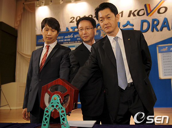 28일 오전 서울 청담동 호텔 리베라에서 열린 프로배구 2010~2011시즌 남자 드래프트에서 1순위 지명권 후보인 KEPCO45,우리캐피탈, LIG손해보험 배구팀의 사무국장들이 지명 순위를 구슬로 추첨하고 있다.