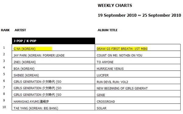 가수 지나(G.NA)가 싱가포르에서 첫 발매된 싱글로 현지 음반 판매 주간 차트 1위에 올랐다.
