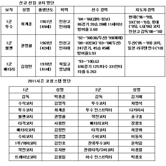 최계훈 코치는 2006년 1군 투수 코치를 맡은 바 있다. 최 코치는 올 시즌 인천고 감독을 지냈다. 또 권명철 코치는 두산에서 은퇴한 후 코치로 활동하다가 올해 일본 프로야구 라쿠텐 이글스에서 연수를 하고 내년 시즌 LG 1군 불펜 코치를 맡게 됐다.