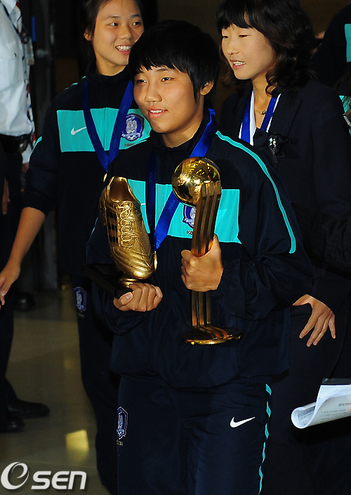 '2010 FIFA U-17 여자 월드컵'서 우승을 차지한 여자 청소년대표팀이 28일 오후 인천공항을 통해 금의환향했다.