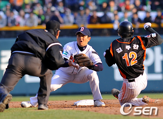 두산은 SK와 함께 발야구 열풍을 일으킨 주역이다. 그러나 올해 눈에 띄게 주력이 떨어진 모습이었다. 팀 도루 128개로 리그 전체 5위에 그쳤다. 비록 도루는 줄었지만 그만큼 상대의 도루를 잘 저지했다. 올해 두산이 허용한 도루는 119개로 SK(109개) 다음으로 적다. 그러나 유독 롯데의 발을 묶는 데에는 실패했다. 올해 19차례 맞대결에서 롯데에게 무려 20개의 도루를 허용했다. 더 정확하게 파고 들어가면 김주찬이라는 존재가 뚜렷하게 드러난다.
