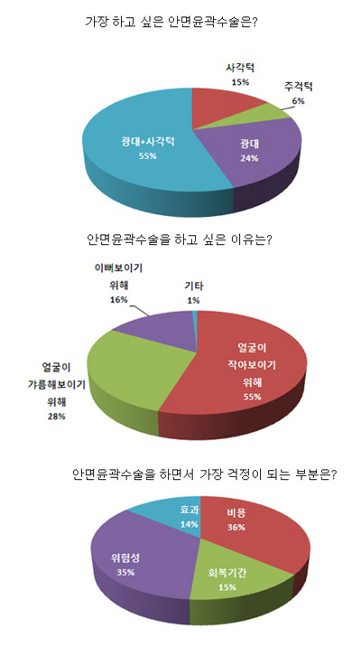 또한 안면윤곽수술을 하고 싶은 이유로 ‘얼굴이 작아보이기 위해’ 55%, ‘얼굴이 갸름해 보이기 위해’ 28%, ‘이뻐보이기 위해’ 16% 등으로 나타났다.